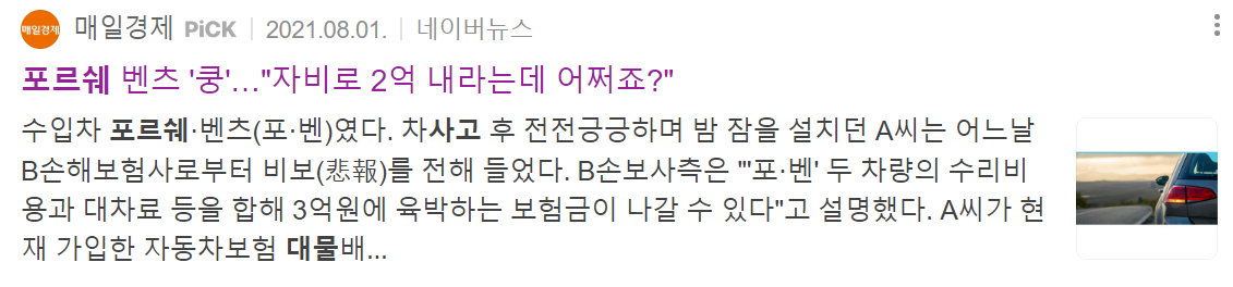 우리가 흔히 접하는 대물보상 사례는 수입차와 사고입니다.