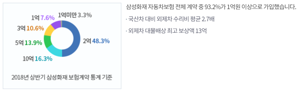 삼성화재 자동차보험 가입 통계를 보면 93% 가입자가 1억원 이상으로 가입했습니다. 또, 다이렉트 자동차 보험 가입시 기본 대물 한도는 2억이 기본 값으로 설정되어 있습니다.