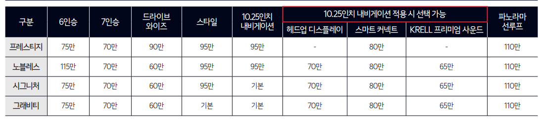 옵션은 너무나 뻔한 결과입니다. 내비게이션 옵션을 넣지 않으면 8인치 구형 내비게이션이 들어 있으니, 거의 필수적으로 선택하게 됩니다. 2위를 차지한 드라이브 와이즈는 안전 옵션입니다.