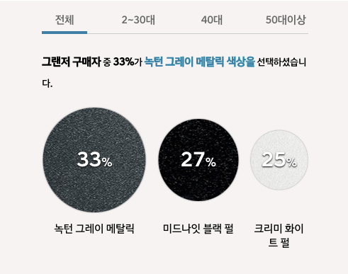 40대는 크리미 화이트 펄이 가장 인기가 좋고, 50대 이상에선 녹턴 그레이 메탈릭이 인기가 좋습니다.