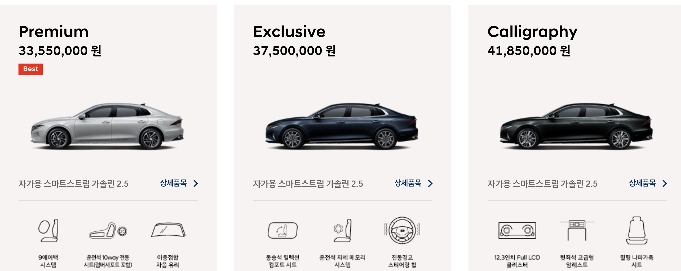 보통은 중간 트림이 가장 잘 팔리는데, 가장 기본 등급인 프리미엄이 제일 많이 팔리고 있습니다.