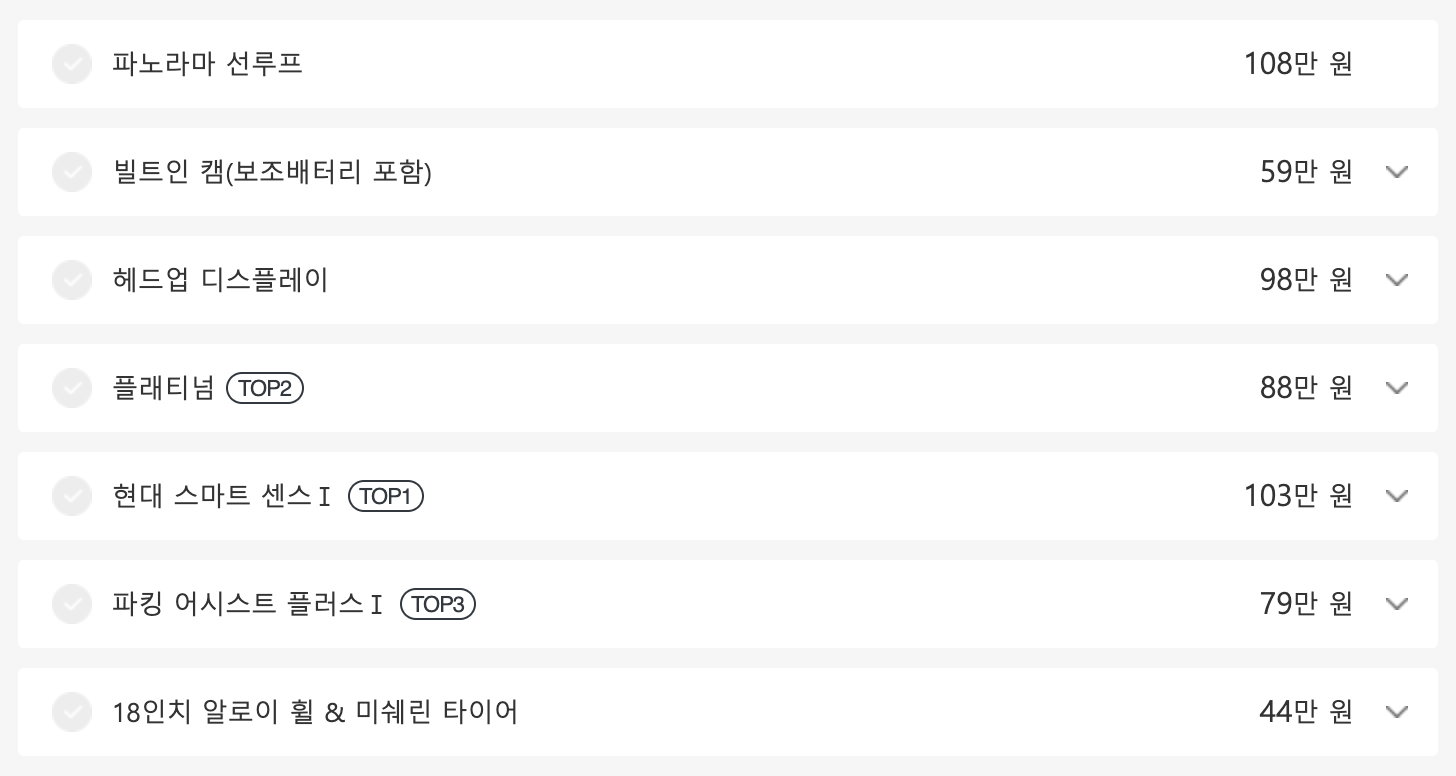 현대차 홈페이지와 다나와 자동차 결과를 보면 공통되는 두 개의 옵션이 있습니다.
