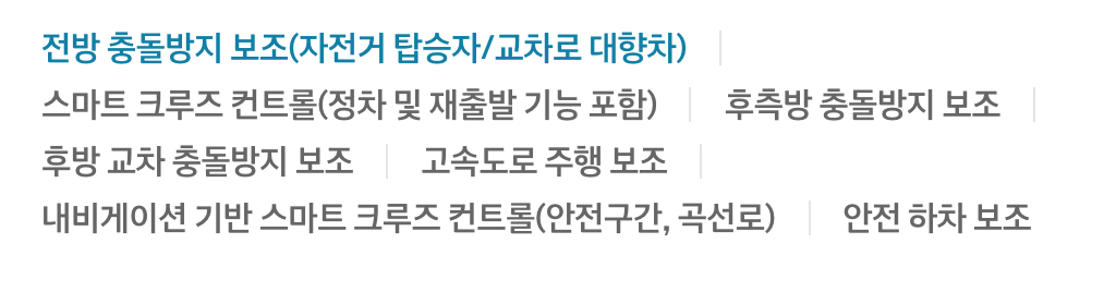 7가지 기능이 탑재되어 있는데요. 그 중에서 눈여겨 볼 부분은 <전방 충돌방지 보조>, <스마트 크루즈 컨트롤>, <후방 교차 충돌방지 보조> 기능입니다.