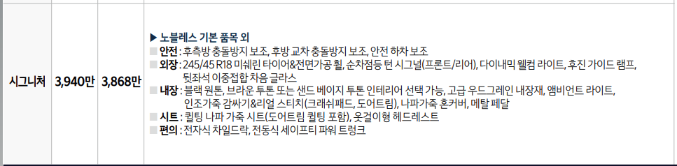 - 시그니처(가솔린 2.5) : 3868만원