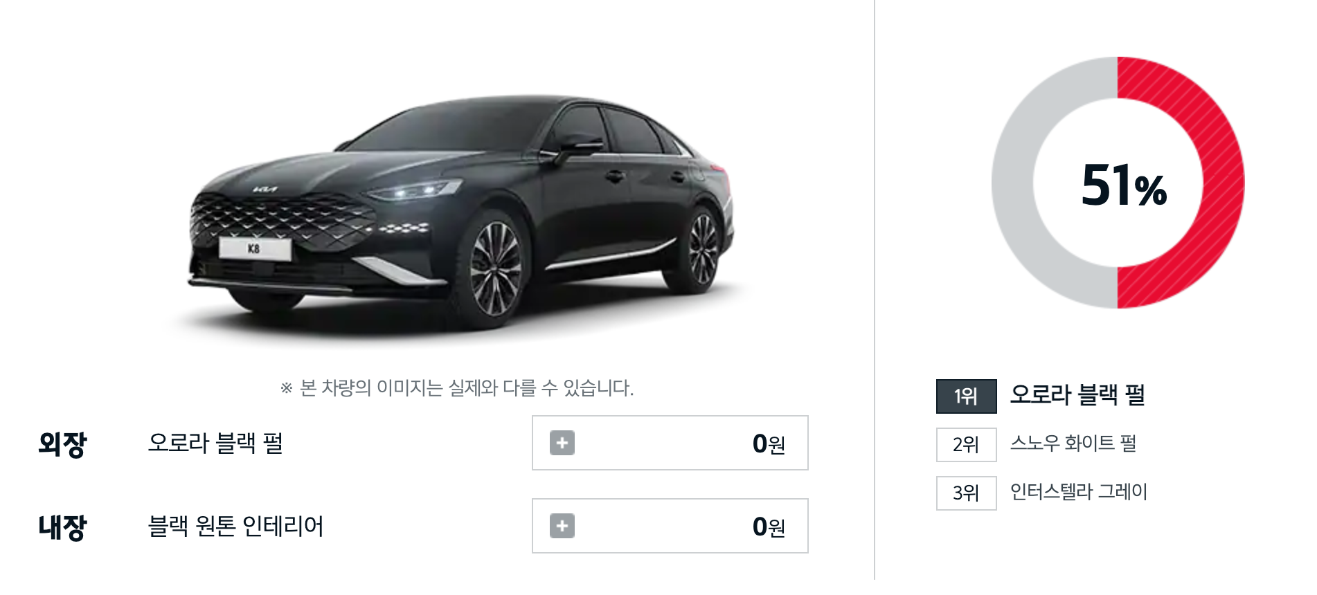 경쟁차종인 그랜저 인기색상과는 다소 다릅니다. 그랜저에서 블랙 색상은 2위에 불과했습니다.