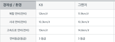 경쟁차종인 그랜저와 비교해봐도 연비면에선 조금 더 앞서고 있습니다.