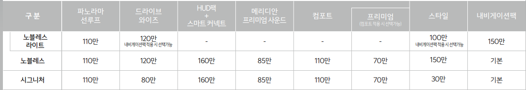 - 노블레스 라이트(가솔린 2.5) : 3279만원
