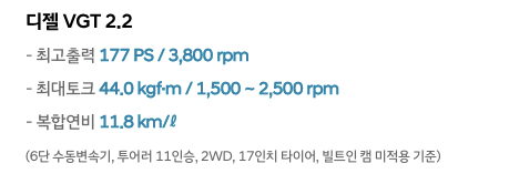 - 엔진 : 디젤 VTG 2.2