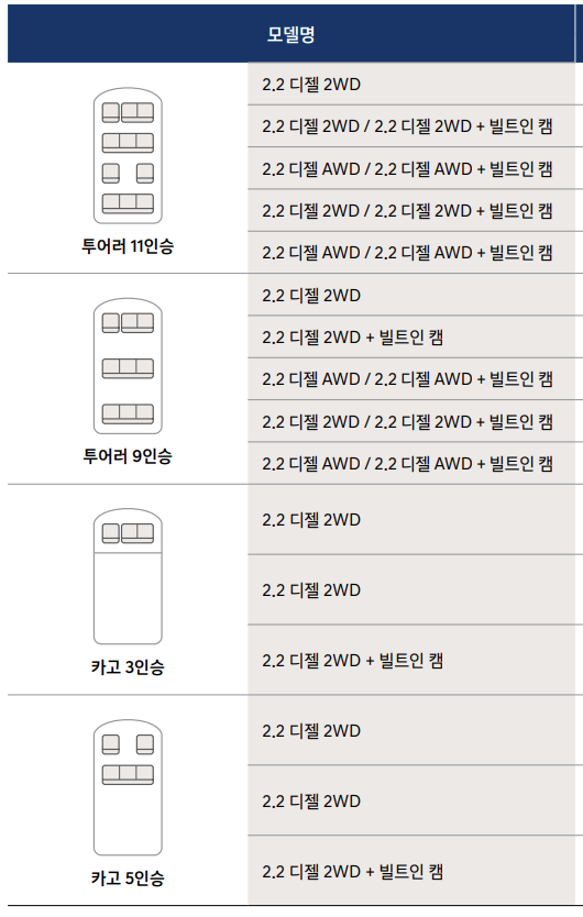 - 좌석 : 투어러 9인승/투어러 11인승, 카고 3인승/카고 5인승