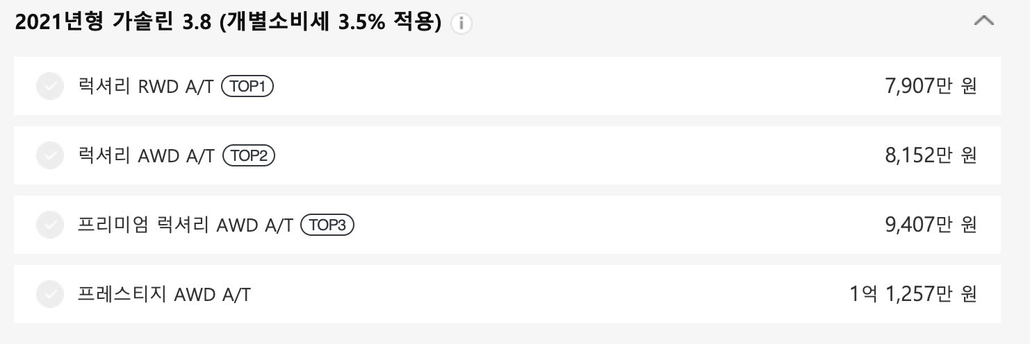 - G90 가솔린 5.0 프레스티지 : 1억 2057만원