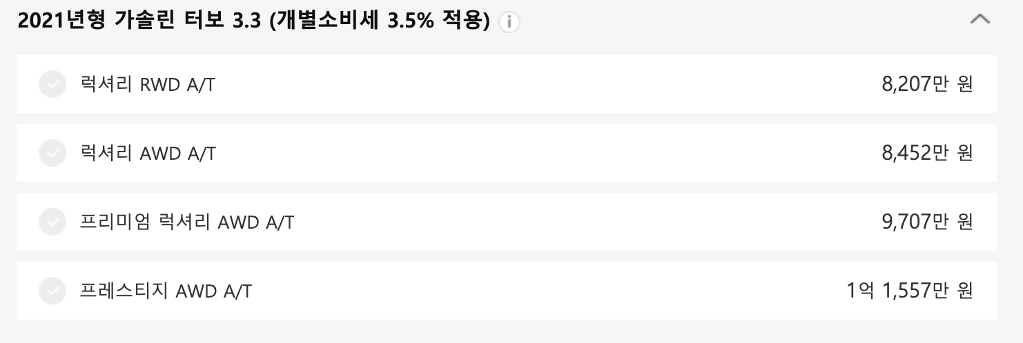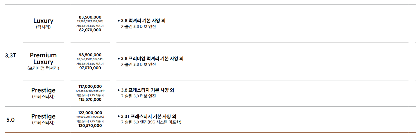 같은 사양이라도 G90 가격은 3.8 < 터보 3.3 < 5.0 순으로 되어 있습니다.