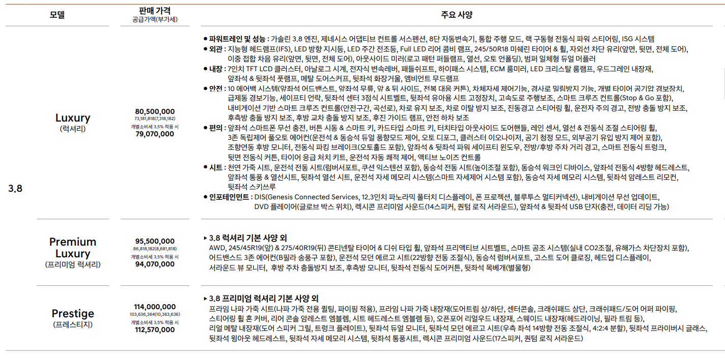 - G90 가솔린 3.8 프레스티지 : 1억 1257만원