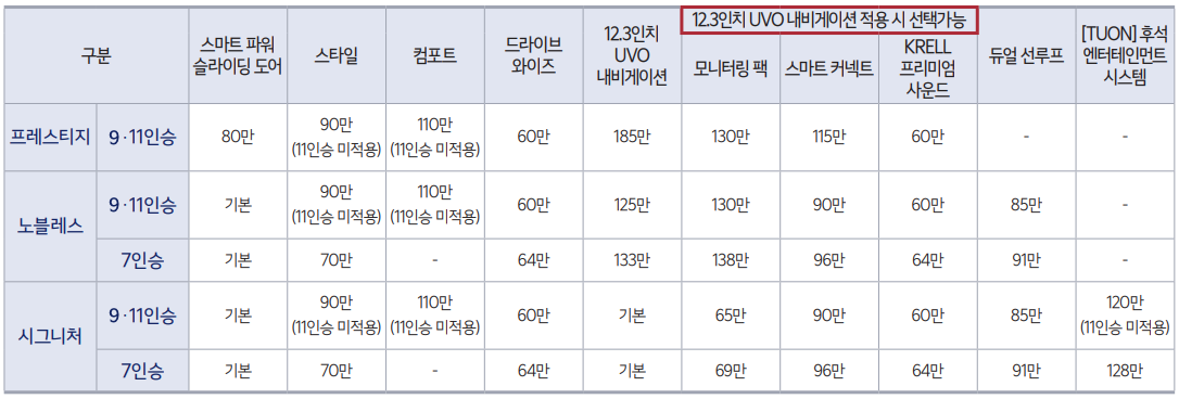 - 가솔린 3.5(9인승/11인승) 시그니처 : 3985만원