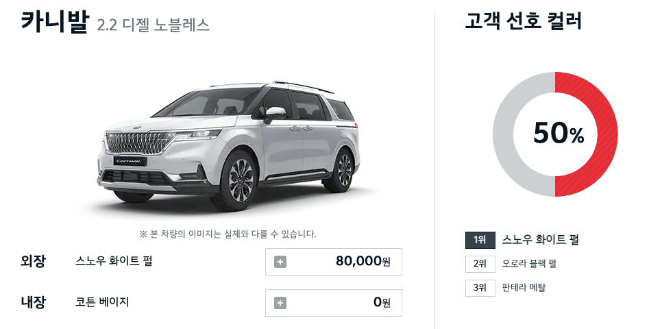 어떤 색을 가장 많이 골랐을까요? 카니발 인기색상은 스노우 화이트 펄입니다.