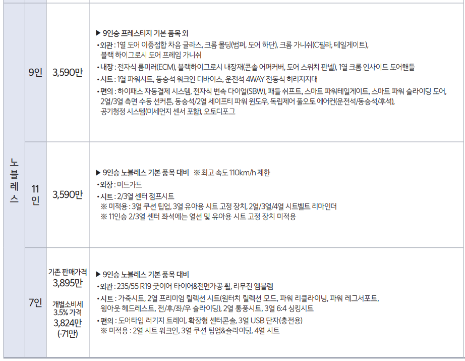 - 가솔린 3.5(9인승/11인승) 노블레스 : 3590만원