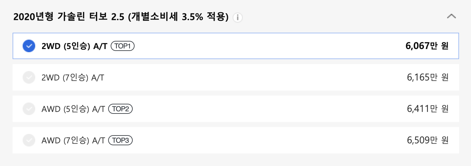 인기트림 1~3위는 모두 가솔린 터보2.5 트림입니다.