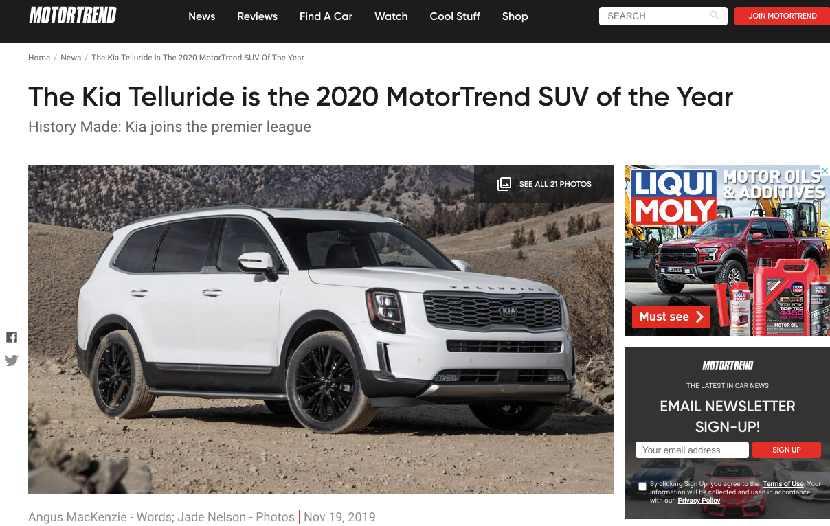 미국에서 2020년 올해에 차로 6관왕을 달성한 텔루라이드에 대해서 자세히 알아봤습니다.