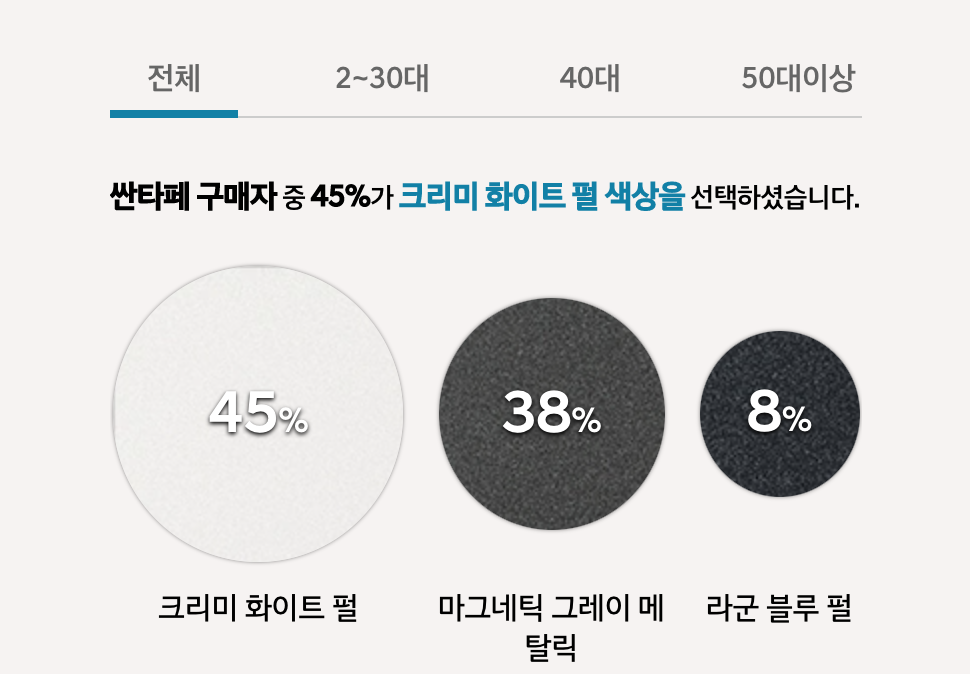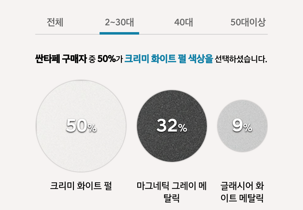 연령대로 보면 50대 이상을 제외하고 20~40대는 크리미 화이트 펄 선택이 절반이 넘습니다.