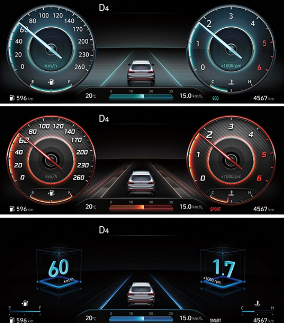 특히 운전모드에 따라 계기판의 컨셉과 컬러가 바뀌는데 이 장면이 꽤나 인상적이네요.
