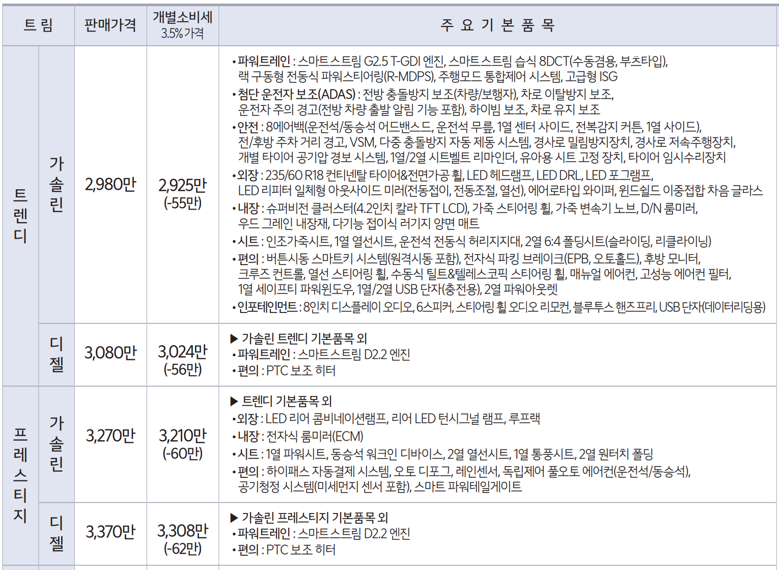 - 트렌디 가솔린 : 2925만원