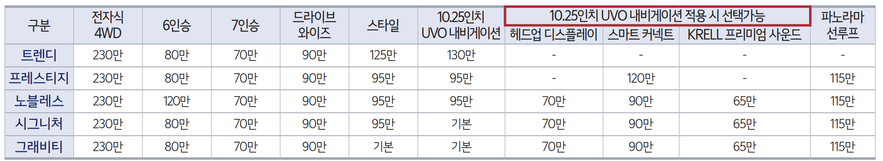 등급별, 옵션별 가격을 자세히 알려드리겠습니다.
