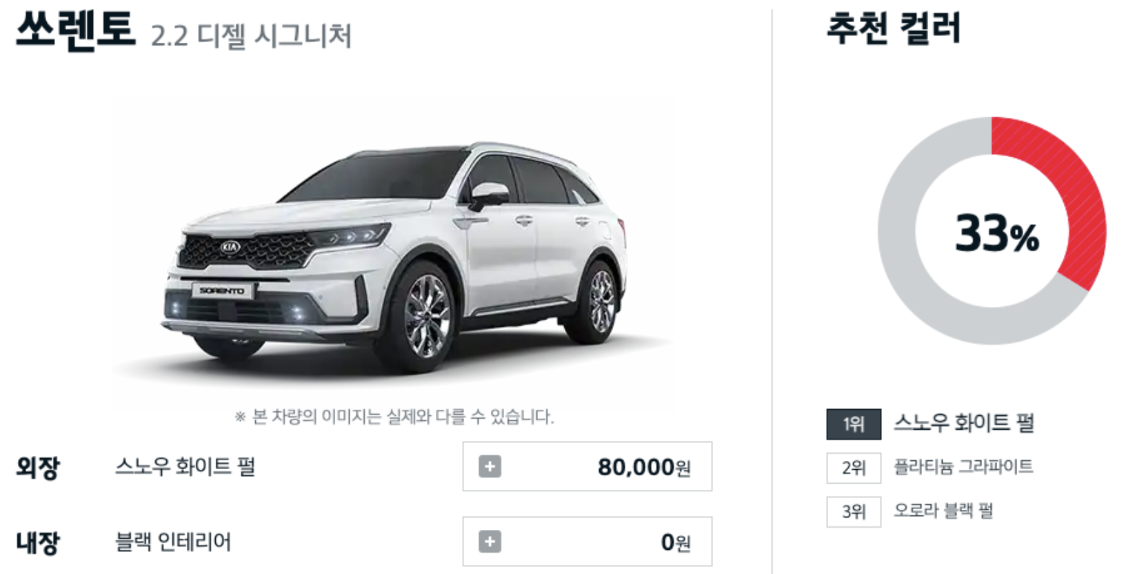 쏘렌토 구매 고객중 주문이 가장 많은 색상 3가지를 알려드리겠습니다.