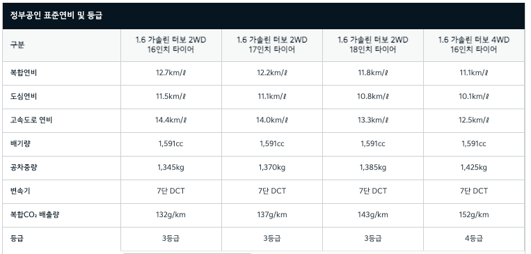 - 엔진 : 감마 1.6 가솔린 T-GDI