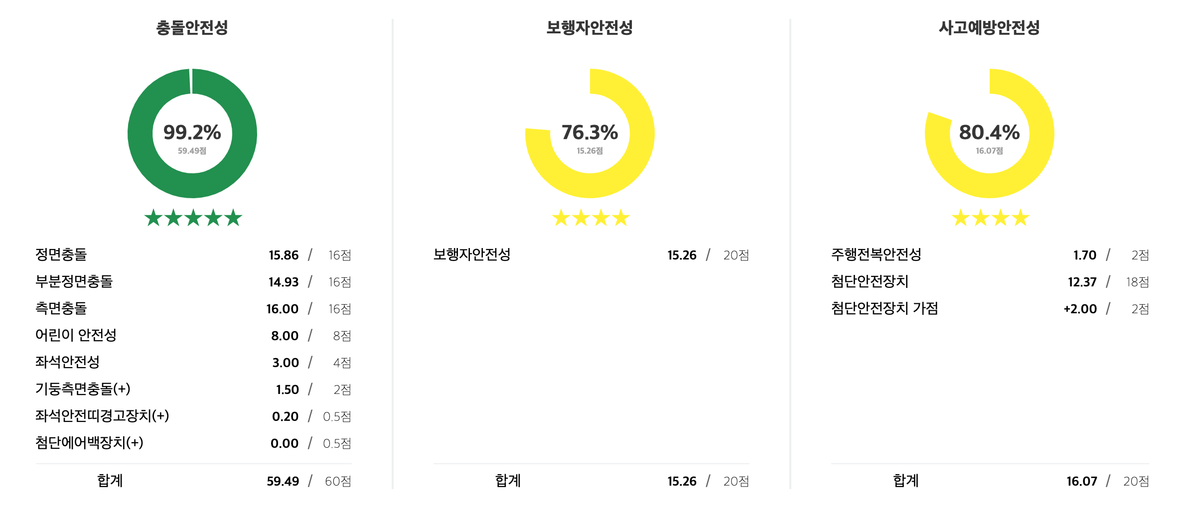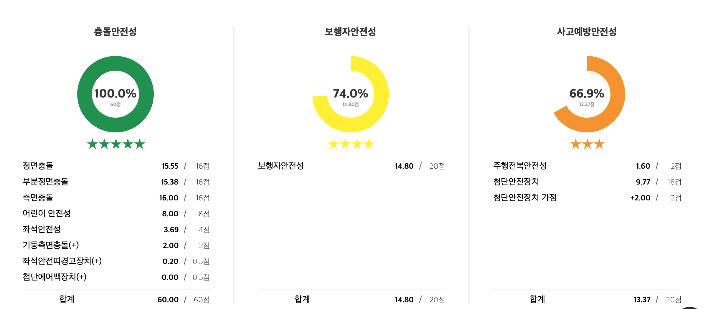 보행자 안전성과 사고예방안전성에서는 별 4개를 받았습니다.