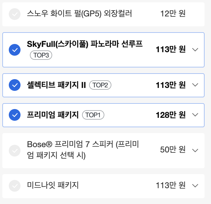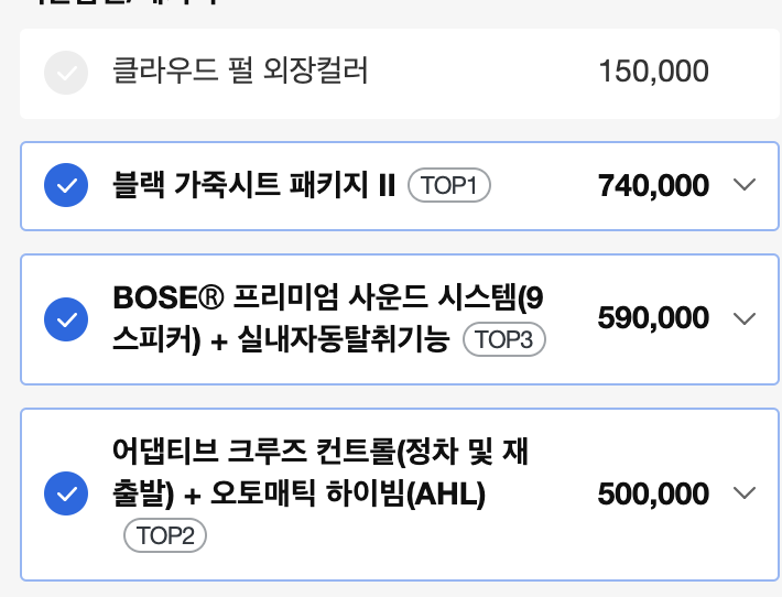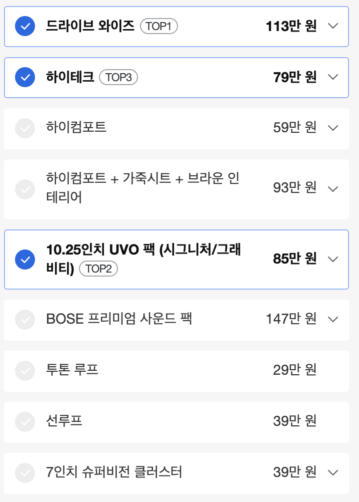 가장 많이 선택하는 옵션 3가지는 드라이브 와이즈, 10인치 우보팩, 하이테크입니다.