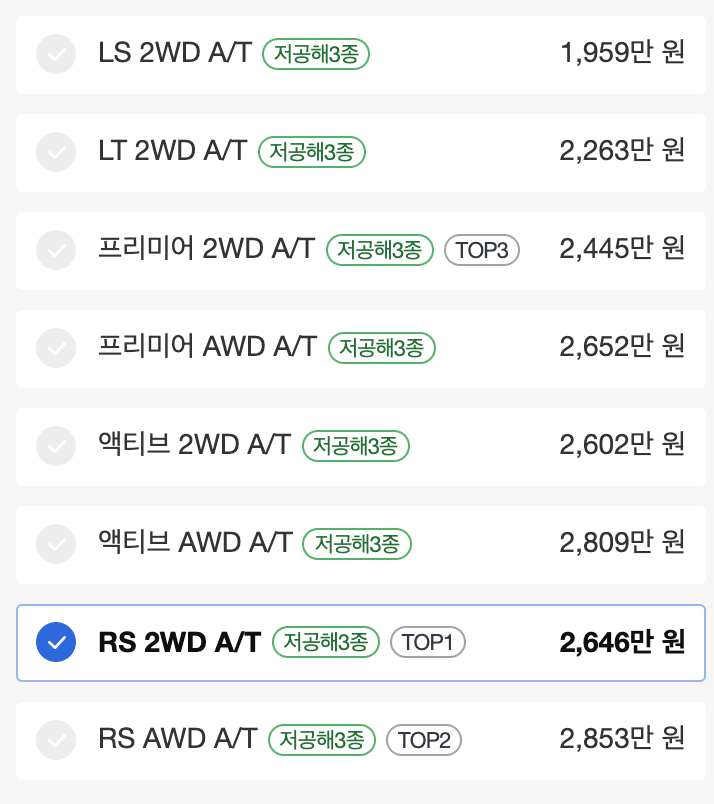 가장 기본 트림인 LS부터 시작해서, LT, 프리미어, 액티브, 최고등급인 RS까지 구성되어 있네요.