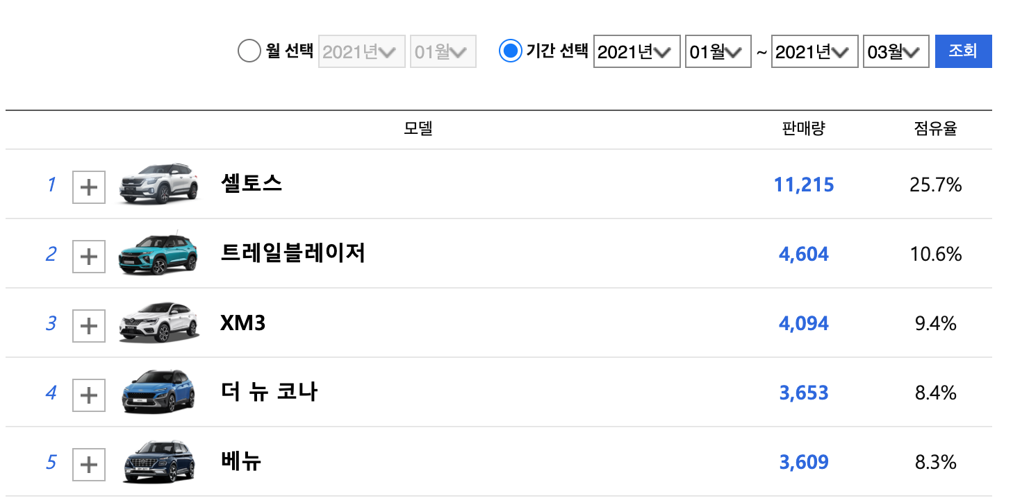 2021년 1분기 판매량에선 셀토스가 11000대를 판매하였고,