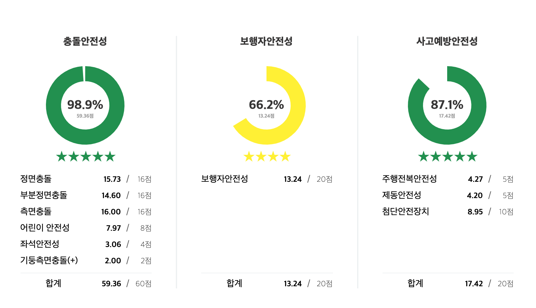 주목할점은 충돌안전성에서는 완벽한 퍼팩트 점수로 별 5개를 획득했습니다.