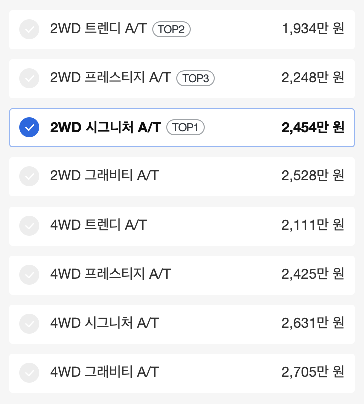 차량 비교는 두 번째 트림으로 했습니다.
