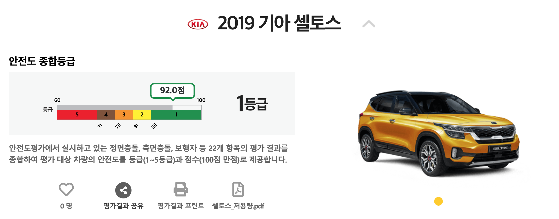 셀토스는 안전도 평가 1등급중에서도 세 차종중 가장 높은 점수를 받았습니다.