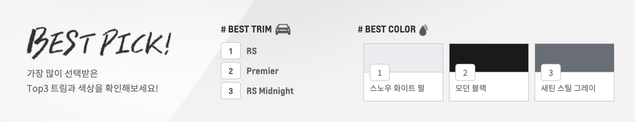 화이트 계열의 스노우 화이트 펄이 가장 인기 있는 색입니다.
