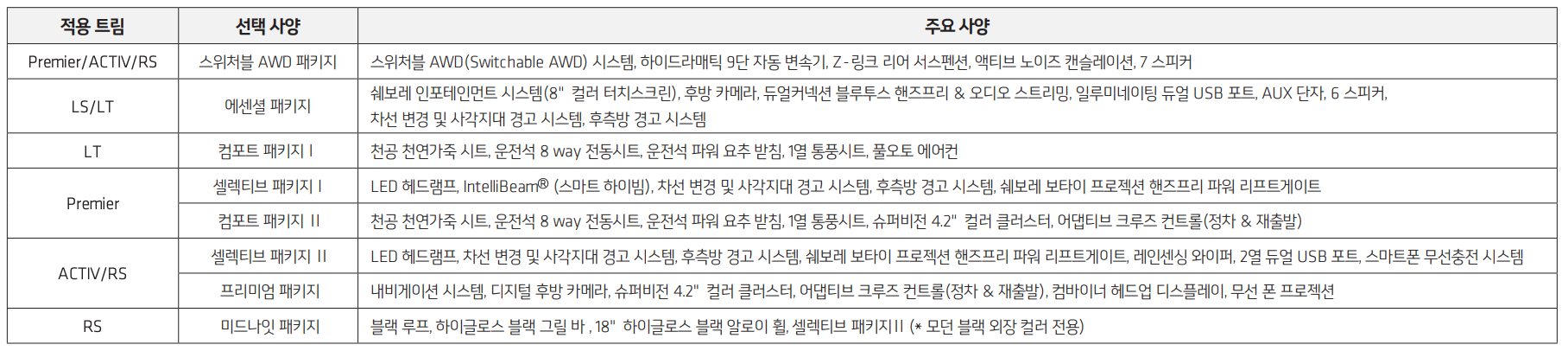 일단은 가장 최상위 등급인 RS를 기본으로, 여기에 4WD가 가능한 스위쳐블 AWD 패키지를 추가하고 시작합니다.