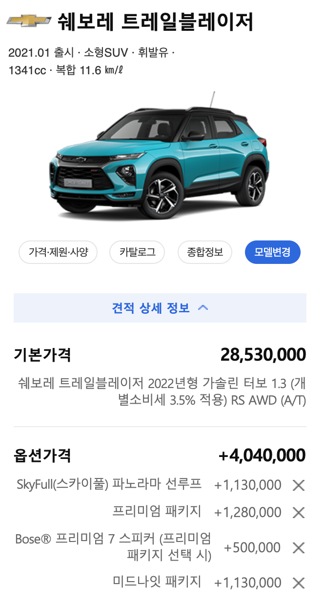 트레일블레이저에 모든 기능을 다 갖춘 플옵션을 선택하면 가격이 얼마나 될까요?