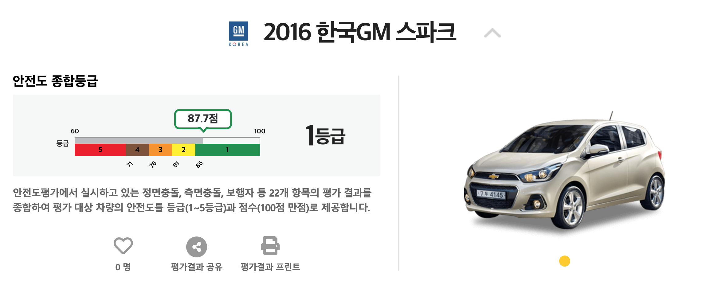 또 다른 경차 스파크의 안전도 평가를 살펴보겠습니다.