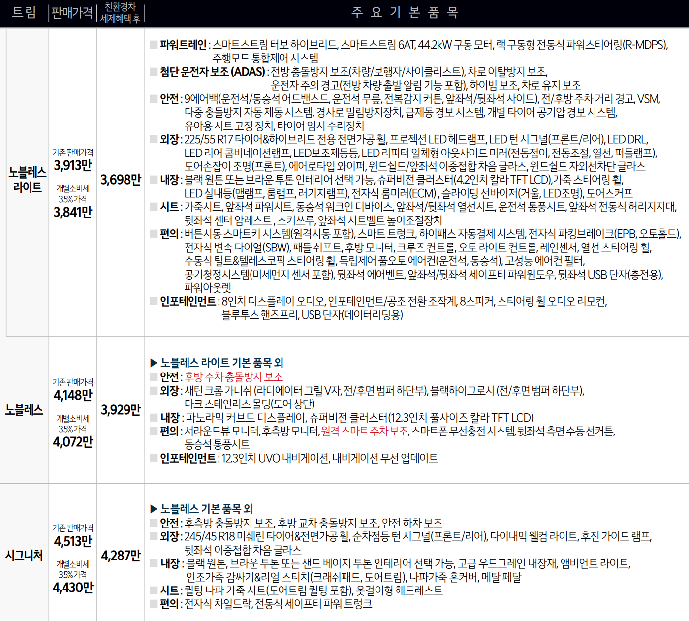 가성비 옵션을 원한다면 노블레스 트림을 선택이 유리합니다.