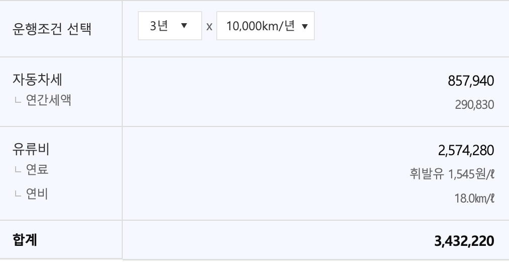 K8과 하이브리드 가격 차이는 약 400만원이 납니다. 이 기준으로 3년기준으로 연간 1만 km 운행한다고 가정하면