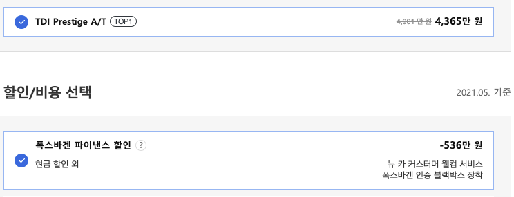 - 티구안 올스페이스 : 4901만원(정가) - 폭스바겐 할인(536만원) = 4365만원