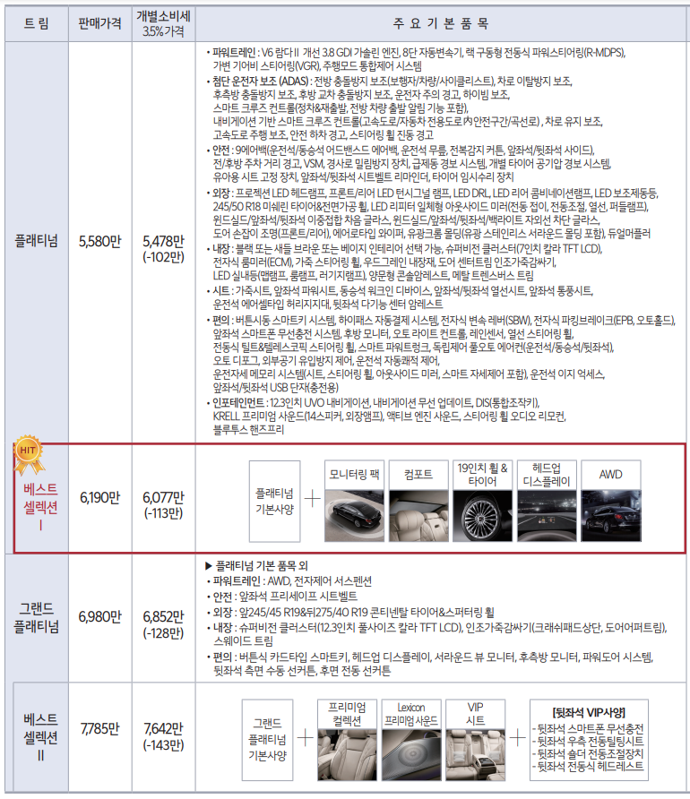 3.8 가솔린 그랜드 플래티넘 베스트 셀렉션2 : 7642만원