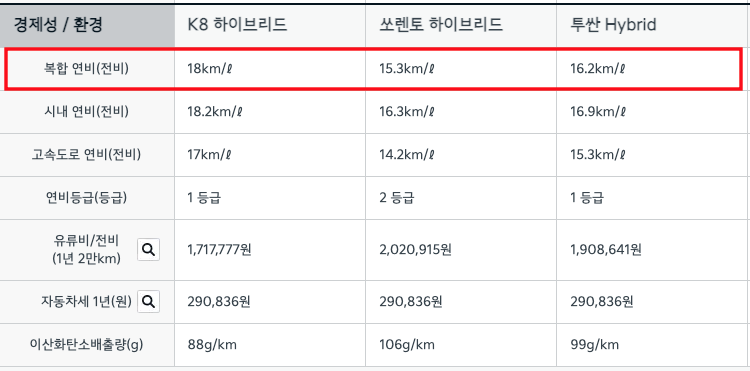 공차중량을 보면 K8 하이브리드는 투싼보다 무겁습니다.