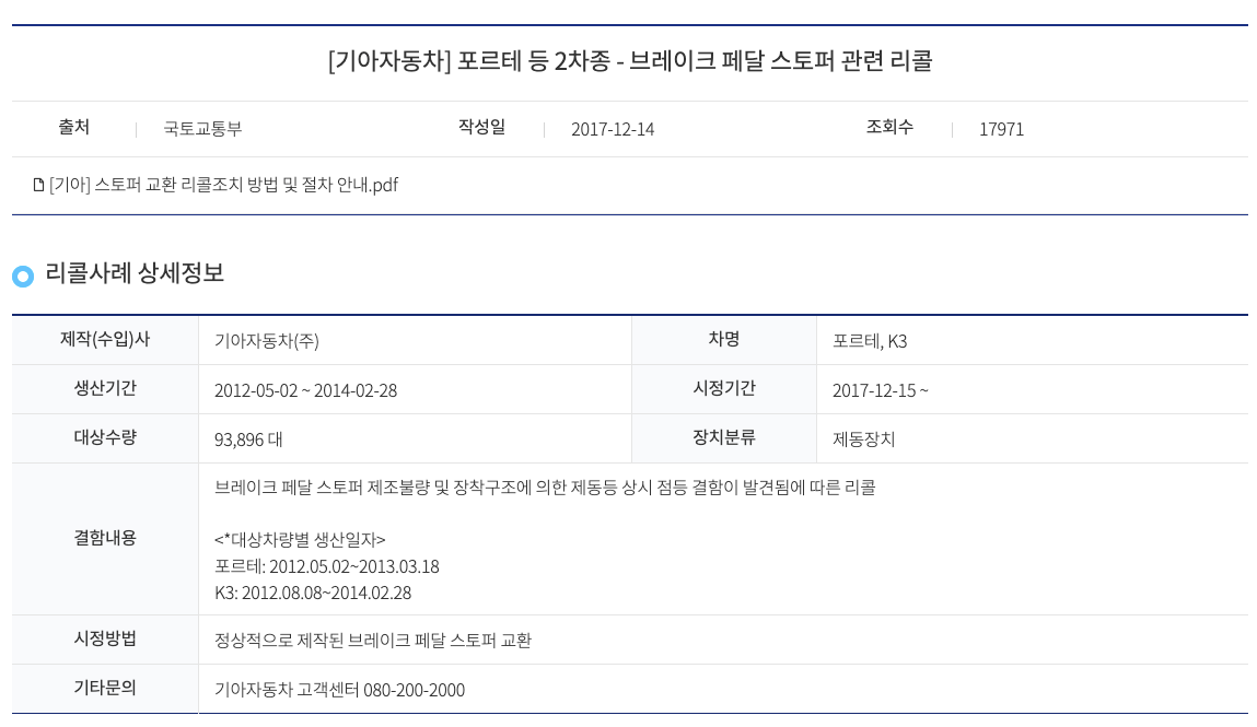 제 차량의 경우 브레이크 페달 스토퍼 불량이라고 나오는데, 제목을 클릭하면 상세 내용을 확인할 수 있습니다.