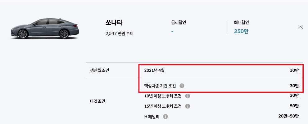 - 핵심차종 기간조건(4월 16일 이전 계약, 6월 내 출고 조건) : 30만원 할인