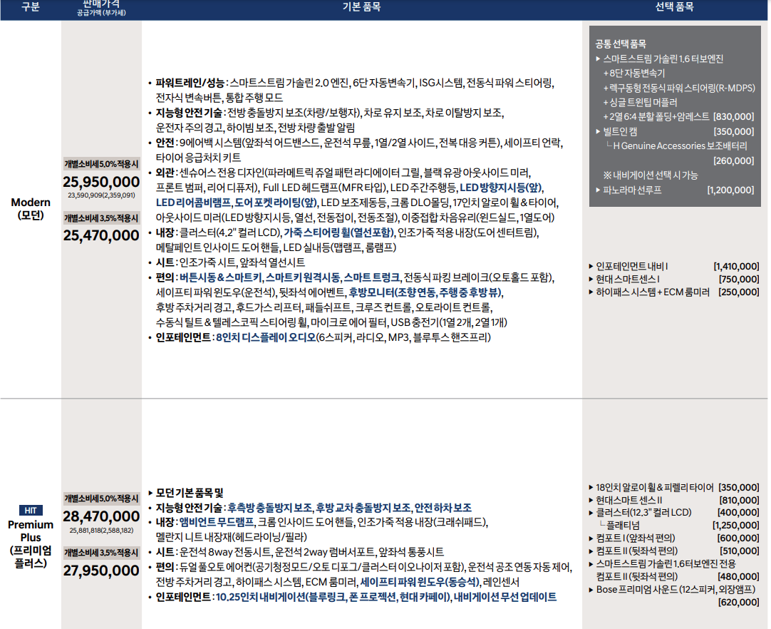 트림별 특징은 아래 쏘나타 센슈어스 가격표에서 자세히 다루겠습니다.