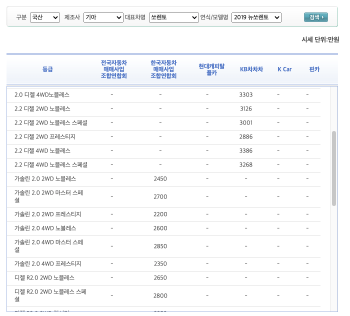 투싼, 싼타페, 쏘렌토 중고차 시세표를 중심으로 엔카를 포함하여