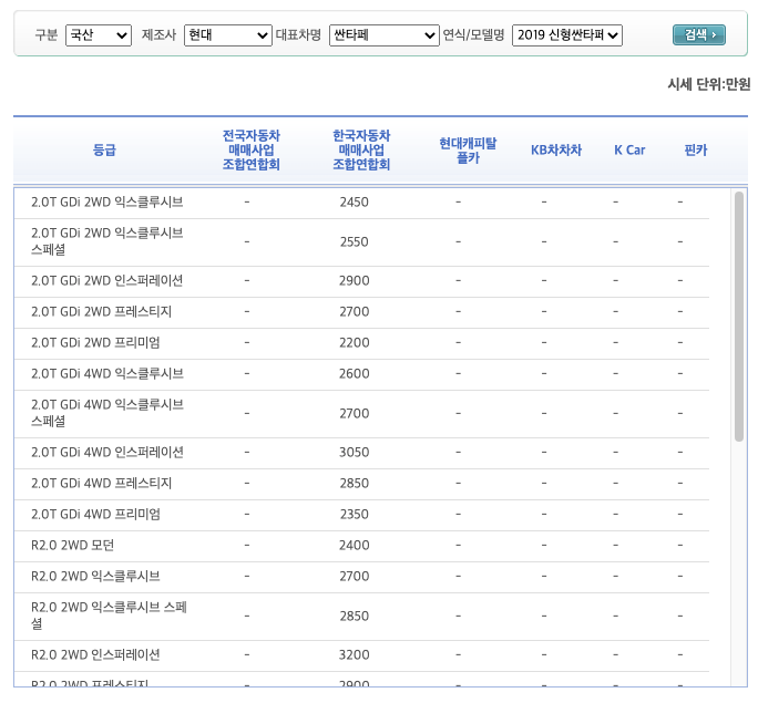 싼타페 중고차 시세표