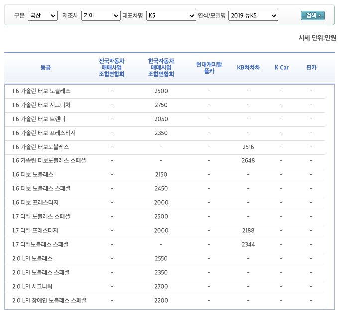 직접적으로 제공하는 것은 아니고 현대캐피탈 KB차차차, K카, 한국 자동차 매매사업조합연합회, 전국자동차매매사업조합연합회에서 제공받은 시세를 종합적으로 보여주는 곳입니다.