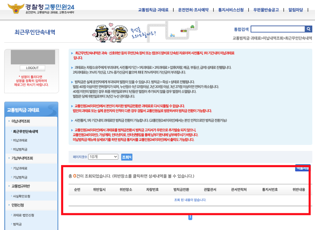 로그인을 했을 때 조회내역이 없다면 신호위반 및 속도위반에 단속되지 않은 것입니다.